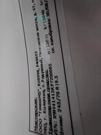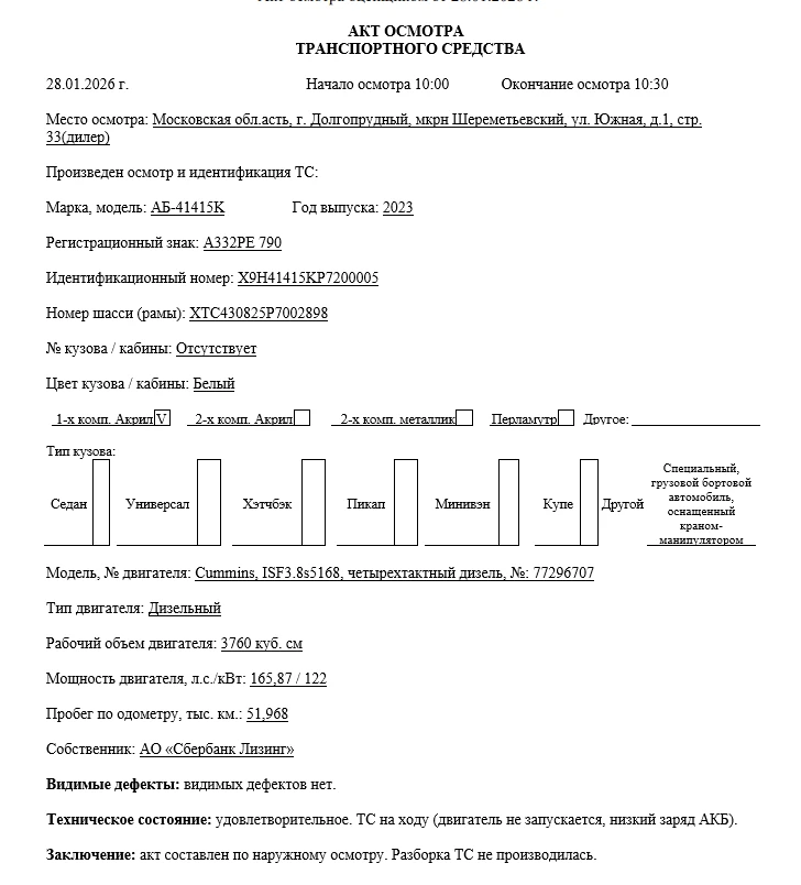 Наименование (тип ТС) Специальный, грузовой бортовой автомобиль, оснащенный краном-манипулятором Марка, модель ТС АБ-41415K Идентификационный номер X9H41415KP7200005 Категория ТС Категория C Год выпуска ТС 2023 Модель / № двигателя Cummins, ISF3.8s5168, четырехтактный дизель, №: 77296707 Шасси № XTC430825P7002898 Кузов (кабина) № Отсутствует Цвет кузова (кабины) Белый Мощность двигателя, л.с./кВт 165,87 / 122 Рабочий объем двигателя, куб.см 3 760 Тип двигателя Дизельный Экологический класс Пятый Сведения о базовом ТС (шасси): Номер паспорта базового ТС (шасси) 264301001984217 Дата оформления паспорта базового ТС 22.06.2023 Идентификационный номер базового ТС XTC430825P7002898 Марка базового ТС (шасси) КАМАЗ Разрешенная максимальная масса, кг 11 990 Масса без нагрузки, кг 7 950 Тип КПП Механическая, с ручным управлением Комплектация/ модификация Колесная формула/ведущие колеса: 4x2/задние. Манипулятор - XCMG SQS 125-4 Организация-изготовитель ТС Общество с ограниченной ответственностью "ЦЕНТРТРАНСТЕХМАШ" Страна изготовителя Российская Федераци
