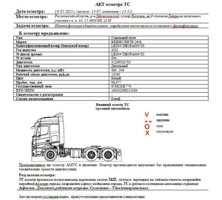 Объект оценки Седельный тягач Зав. № машины (VIN) LBZ447DB5PA004720 Марка, модель BEIBEN BBTR 2648 Тип ТС Грузовой Год вып. 2023 Двигатель 3123F052705 Шасси LBZ447DB5PA004720 Кузов (кабина, прицеп) Отс. Цвет Белый Мощность двигателя, л.с. 480 Объем двиг., см3 12540 Тип дв. Дизельный Тип кузова Грузовой КПП Автоматическая Экологический клаасс 5 Разрешенная максимальная масса, кг 29300 Масса без нагрузки, кг 9300 Грузоподъемность, т. 20000 Страна-производитель Китай Страна-изготовитель Китай ПТС / ЭПТС 164302069315384 Владелец АО «Сбербанк Лизинг» Адрес регистрации ТС - Рег. № О 062 КН 774 Пробег, тыс.км 98,977