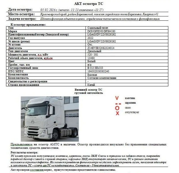 Седельный тягач Зав. № машины (VIN) LGAG3DV22N8829262 Марка, модель DONGFENG DFH4180 Тип ТС Грузовой Год вып. 2022 Двигатель Z14EVIE52082324014 Шасси LGAG3DV22N8829262 Кузов (кабина, прицеп) Отс. Цвет Белый Мощность двигателя, л.с. 520 Объем двиг., см3 13480 Тип дв. Дизельный Тип кузова Грузовой КПП Автоматическая Экологический клаасс 6 Разрешенная максимальная масса, кг 18000 Масса без нагрузки, кг 8440 Грузоподъемность, т. 9 560 Страна-изготовитель Китай Комплектация Базовая Рег. № В 015 НМ 03 Пробег, тыс.км 259392