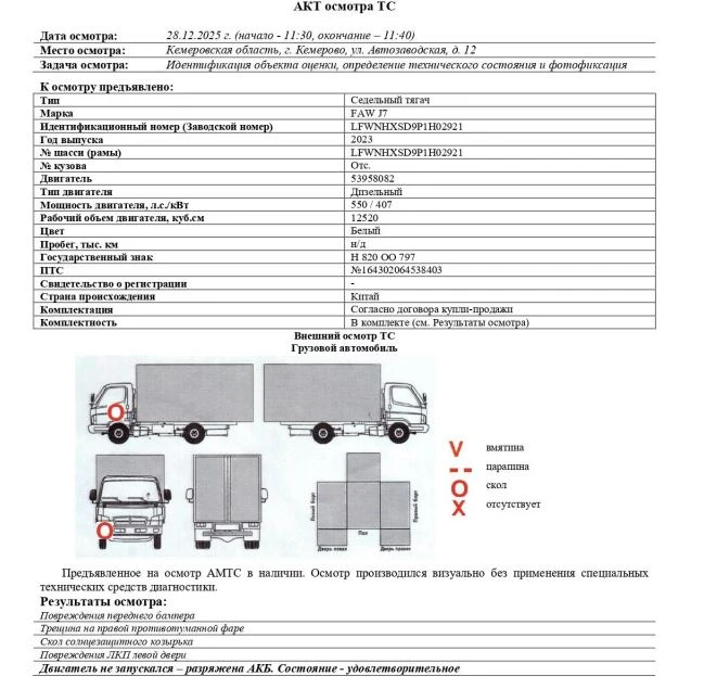 Седельный тягач Зав. № машины (VIN) LFWNHXSD9P1H02921 Марка, модель FAW J7 Тип ТС Грузовой Год вып. 2023 Двигатель 53958082 Шасси LFWNHXSD9P1H02921 Кузов (кабина, прицеп) Отс. Цвет Белый Мощность двигателя, л.с. 550 Объем двиг., см3 12520 Тип дв. Дизельный Тип кузова Грузовой КПП Робот Экологический класс 5 Разрешенная максимальная масса, кг 18000 Масса без нагрузки, кг 8100 Грузоподъемность, кг. 9900 Страна-производитель Китай Страна-изготовитель Китай Владелец АО «Сбербанк Лизинг»