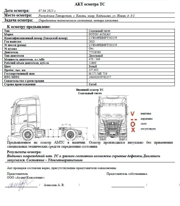 Седельный тягач Зав. № машины (VIN) LVBS6PEB6PT502159 Марка, модель FOTON AUMAN Тип ТС Грузовой Год вып. 2023 Двигатель 77528580 Шасси LVBS6PEB6PT502159 Кузов (кабина, прицеп) Отс. Цвет Белый Мощность двигателя, л.с. 470 Объем двиг., см3 11800 Тип дв. Дизельный Тип кузова Грузовой КПП АКПП Экологический класс 5 Разрешенная максимальная масса, кг 18000 Масса без нагрузки, кг 8040 Грузоподъемность, кг. 9960 Страна-производитель Китай Страна-изготовитель Китай ПТС 164302059761257 Владелец АО «Сбербанк Лизинг»