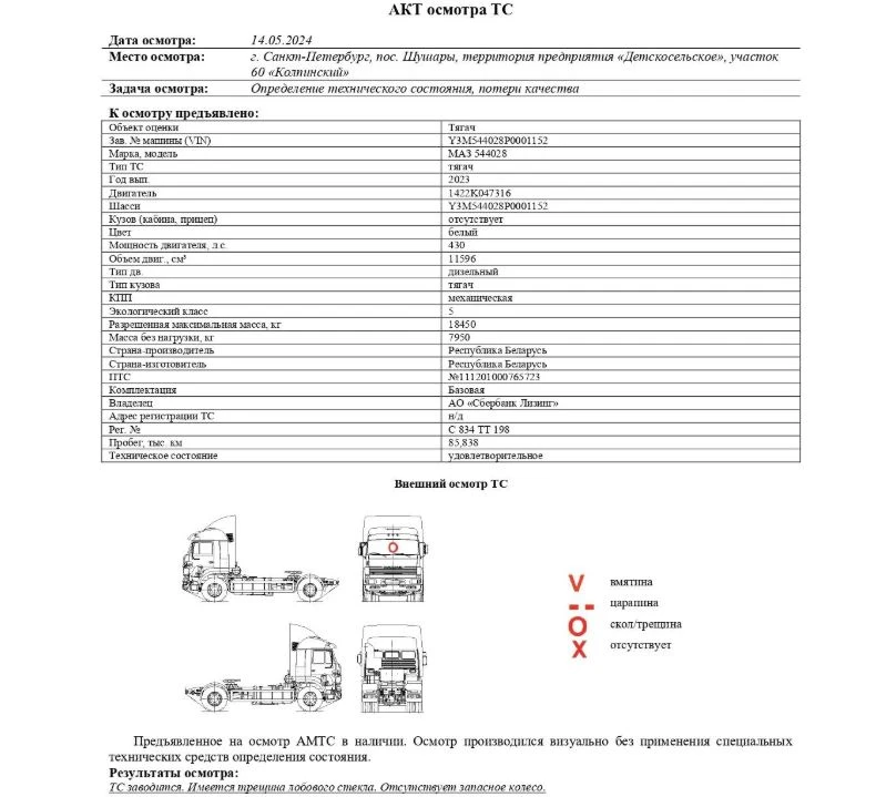 Тягач Зав. № машины (VIN) Y3M544028P0001152 Марка, модель МАЗ 544028 Тип ТС тягач Год вып. 2023 Двигатель 1422K047316 Шасси Y3M544028P0001152 Кузов (кабина, прицеп) отсутствует Цвет белый Мощность двигателя, л.с. 430 Объем двиг., см³ 11596 Тип дв. дизельный Тип кузова тягач КПП механическая Экологический класс 5 Разрешенная максимальная масса, кг 18450 Масса без нагрузки, кг 7950 Страна-производитель Республика Беларусь Страна-изготовитель Республика Беларусь Пробег, тыс. км 85,838