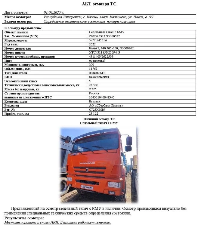 Седельный тягач Зав. № машины (VIN) Z0V5453JAN5000572 Марка, модель УСТ 5453JA Год вып. 2022 Номер двигателя КамАЗ, 740.705-300, N3000862 Номер шасси XTC431185N2569443 Номер кузова (кабины, прицепа) 431140N2622503 Цвет оранжевый Мощность двигателя, л.с. 300 Объем двиг., см3 11762 Тип двигателя дизельный КПП механическая Экологический класс 5 Технически допустимая максимальная масса, кг 22 500 Масса без нагрузки, кг 9 225 Страна-производитель Россия Пробег, тыс. км 23,122