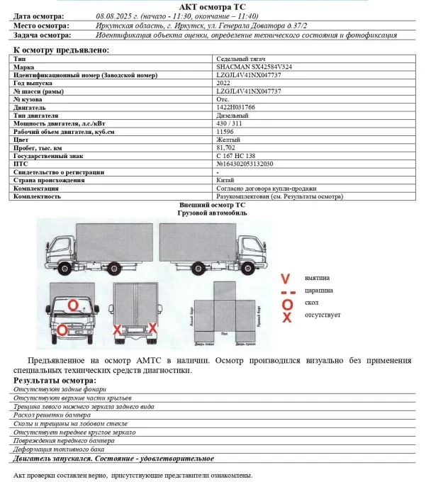 Седельный тягач Зав. № машины (VIN) LZGJL4V41NX047737 Марка, модель SHACMAN SX42584V324 Тип ТС Грузовой Год вып. 2022 Двигатель 1422H031766 Шасси LZGJL4V41NX047737 Кузов (кабина, прицеп) Отс. Цвет Желтый Мощность двигателя, л.с. 430 Объем двиг., см3 11596 Тип дв. Дизельный Тип кузова Грузовой КПП Механическая Экологический класс 5 Разрешенная максимальная масса, кг 25000 Масса без нагрузки, кг 9850 Грузоподъемность, кг. 15150 Страна-производитель Китай Страна-изготовитель Китай ПТС №164302053132030