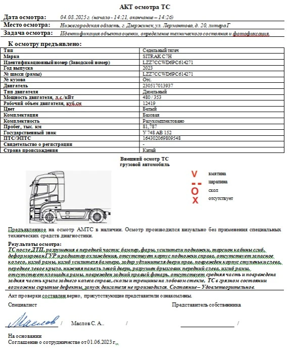 Седельный тягач Зав. № машины (VIN) LZZ7CCWD6PC614271 Марка, модель SITRAK C7Н Тип ТС Грузовой Год вып. 2023 Двигатель 230517013937 Шасси LZZ7CCWD6PC614271 Кузов (кабина, прицеп) Отс. Цвет Белый Мощность двигателя, л.с. 480 Объем двиг., см3 12419 Тип дв. Дизельный Тип кузова Грузовой КПП Автоматическая Экологический клаасс 5 Разрешенная максимальная масса, кг 18000 Масса без нагрузки, кг 7220 Грузоподъемность, т. 10780 Страна-производитель Китай Страна-изготовитель Китай ПТС / ЭПТС 164302069809548 Комплектация Базовая Комплектность Разукомплектовано
