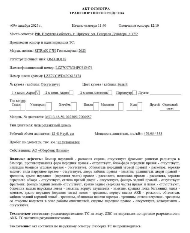 Седельный тягач Марка, модель ТС SITRAK С7Н Идентификационный номер LZZ7CCWD4PC613474 Категория ТС Категория C Год выпуска ТС 2023 Модель, № двигателя MC13.48-50, четырехтактный дизель, №230517006557 Шасси № (рамы) LZZ7CCWD4PC613474 Кузов (кабина, прицепа) № Отсутствует Цвет кузова (кабины) Белый Мощность двигателя, л.с./кВт 479,95 / 353 Рабочий объем двигателя, куб.см 12 419 Тип двигателя Четырехтактный дизель Экологический класс Пятый Разрешенная максимальная масса, кг 18 000 Масса без нагрузки, кг 7 300 Тип КПП механическая, с автоматическим и возможностью ручного управления Комплектация/ модификация Модификация - ZZ4186V391HE. Колесная формула/ведущие колеса: 4x2/задние. Кабина, 2-х местная, с 2-мя спальными местами Организация-изготовитель ТС China National Heavy Duty Truck Group Co., Ltd. Страна изготовителя Китайская Народная Республика
