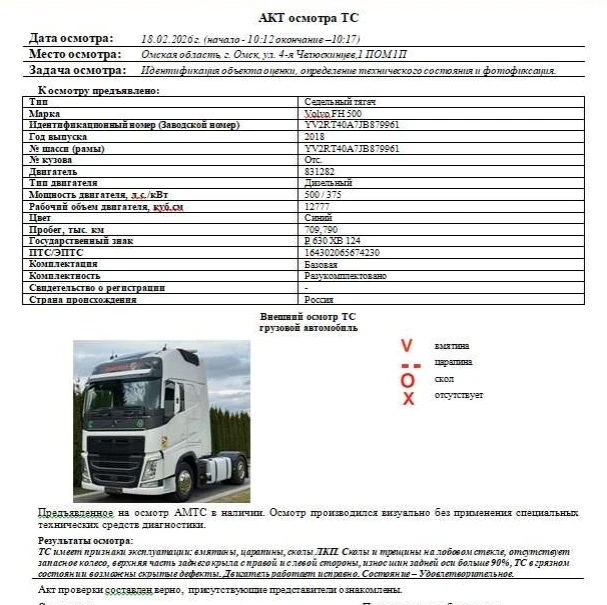Седельный тягач Зав. № машины (VIN) YV2RT40A7JB879961 Марка, модель Volvo FH 500 Тип ТС Грузовой Год вып. 2018 Двигатель 831282 Шасси YV2RT40A7JB879961 Кузов (кабина, прицеп) Отс. Цвет Синий Мощность двигателя, л.с. 500 Объем двиг., см3 12777 Тип дв. Дизельный Тип кузова Грузовой КПП Автоматическая Экологический клаасс 5 Разрешенная максимальная масса, кг 20100 Масса без нагрузки, кг 8610 Грузоподъемность, т. 11 490 Страна-производитель Россия Рег. № Р 630 ХВ 124 Пробег, тыс.км 709,790