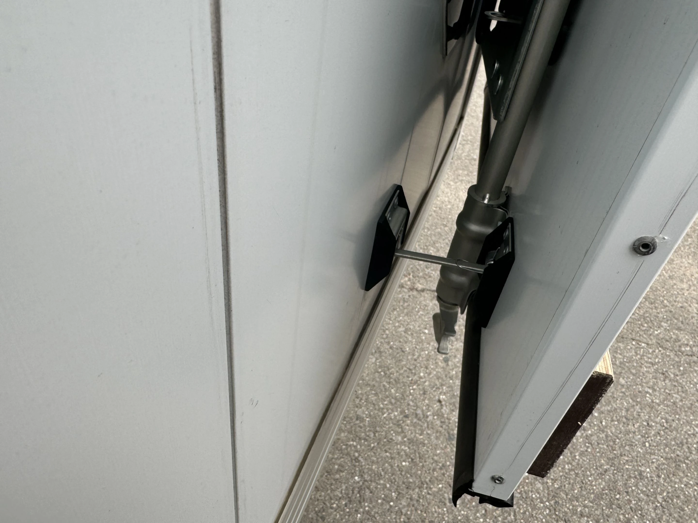 Фурнитура оцинкованная (петли дверные по 2 шт. на дверь, фиксаторы дверей в открытом положении (т-образный) по 1 шт. на дверь. Запорные механизмы - штангового типа, по 1 штанге на дверь; труба Ø22 мм.